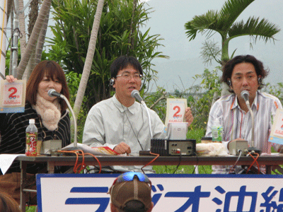 パーソナリティーの真栄平仁さん(右端)玉城美香さん(左端)とともに。
